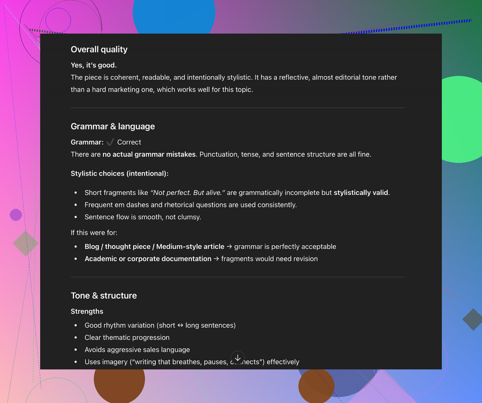 そう感じるなら、そのツールはあなたの代わりに書いてしまっていて、あなたのために書いてはいません。多少の粗さが残っていても、人間らしさを守ったほうがよいです。