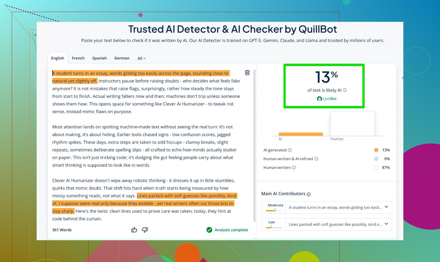- QuillBot detector:13% AI