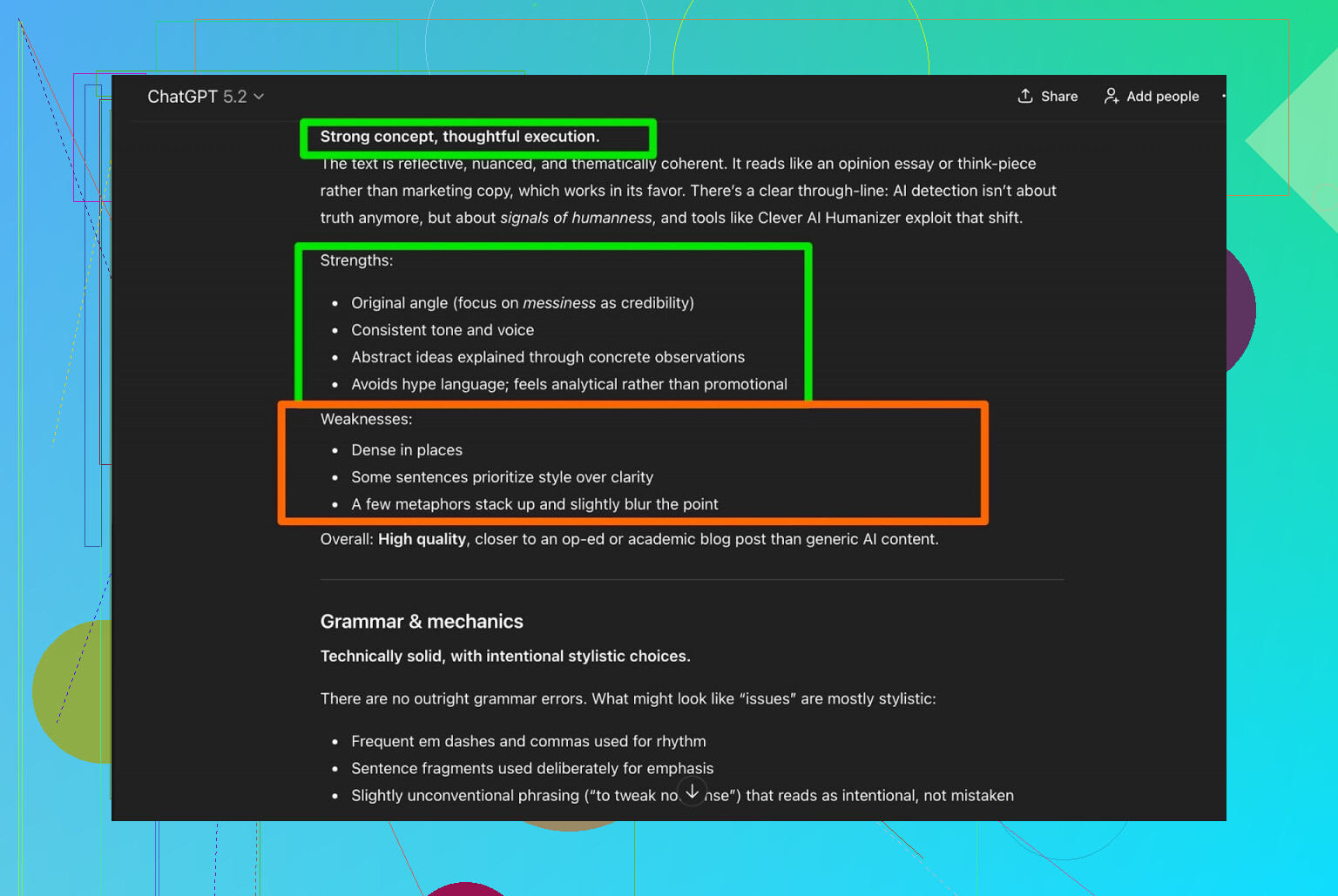 この点では @chasseurdetoiles に近くて、ブランドやブログが「個性・皮肉・ストーリー・キレのある主張」に依存している場合、Clever AI Humanizer に記事全体を書き直させるのはかなりリスキーです。