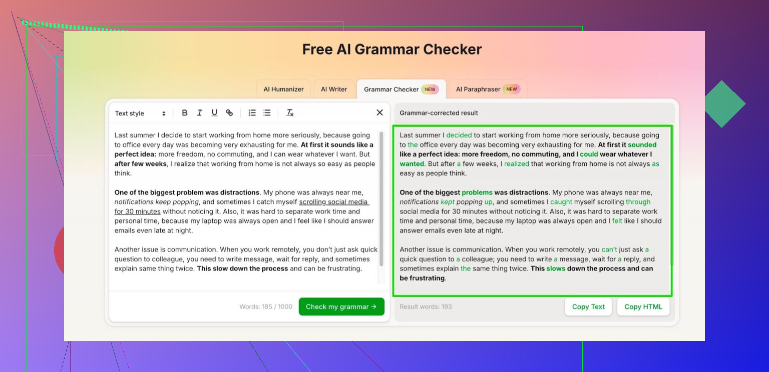 - Pasa solo esas por el corrector gramatical de Clever AI Humanizer y luego compara:
