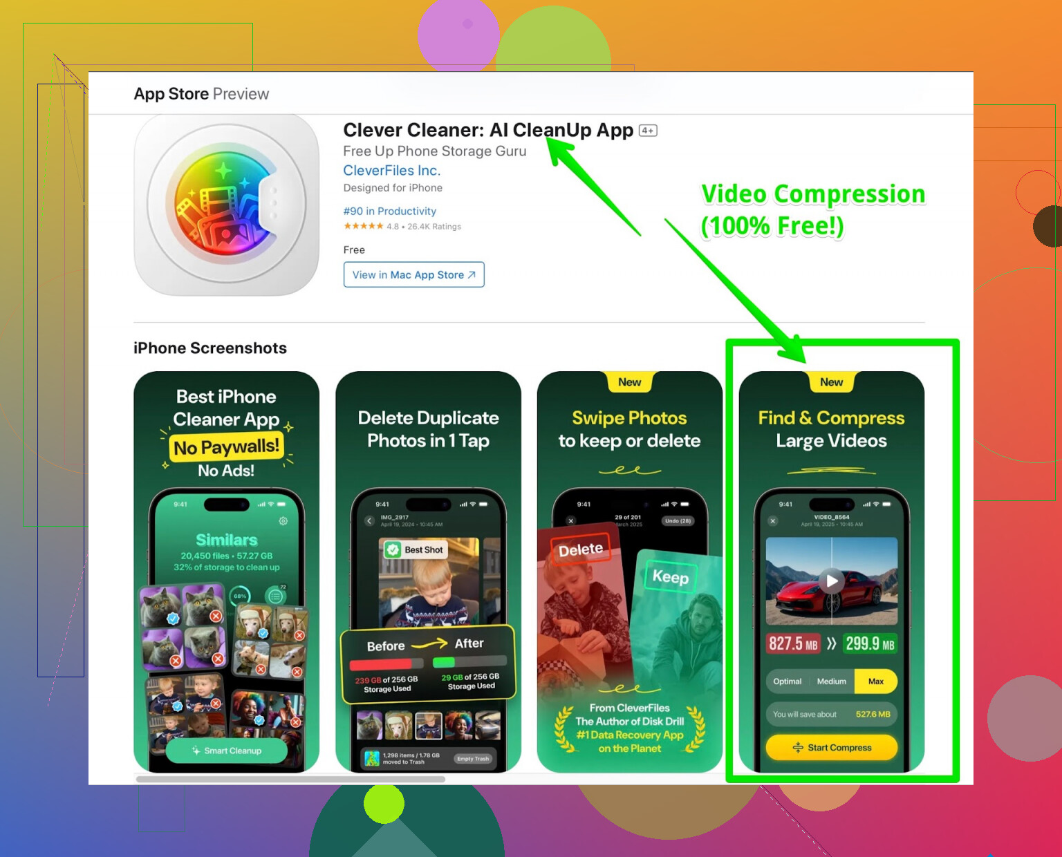- If you wanna try something beyond Clever Cleaner, “Video Compress” by “Zuhanden” and “Compress Videos & Resize Video” get decent marks and aren’t too scammy.