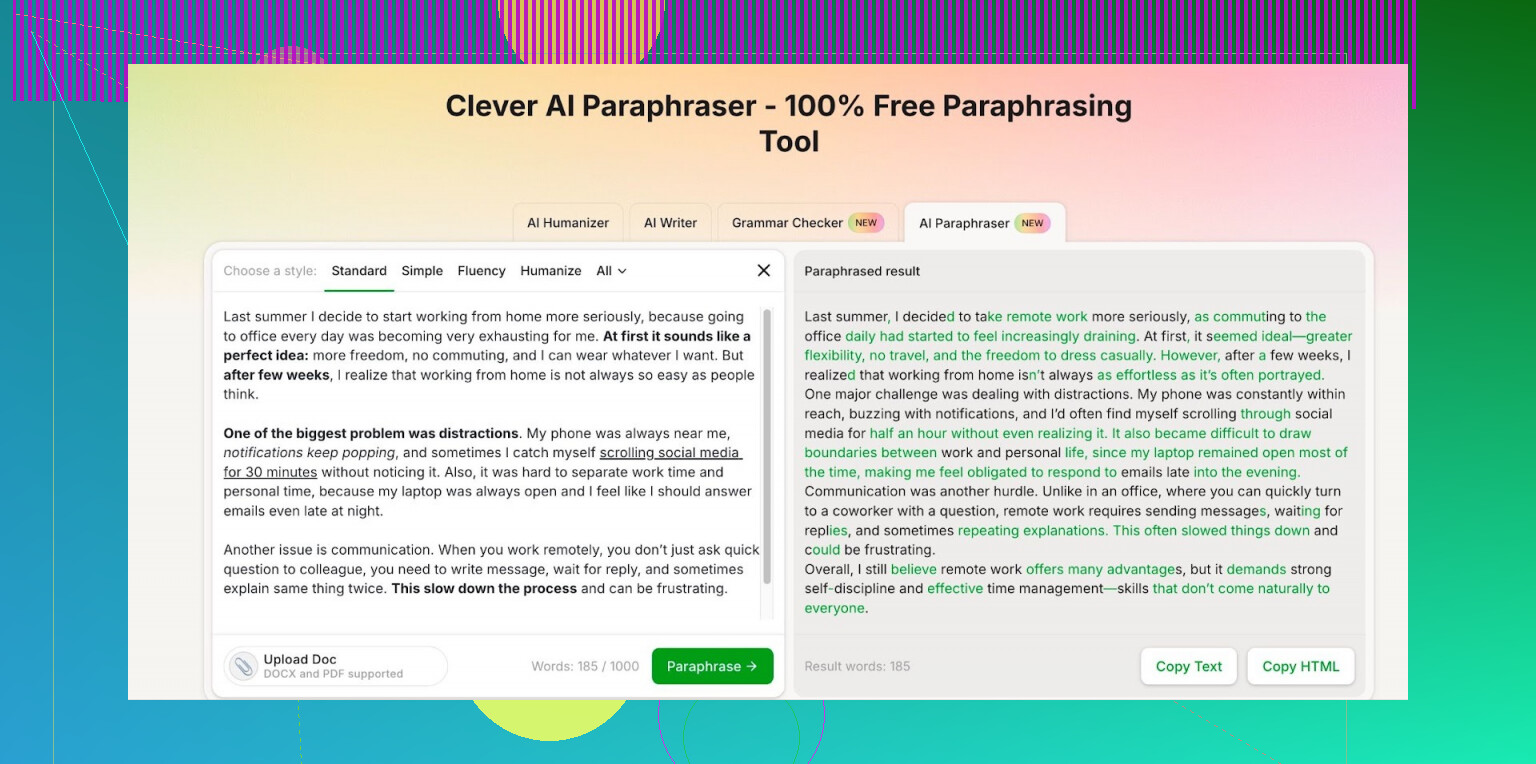 After that I went looking for something simple that would still sound human enough for work stuff. Reports, emails, documentation rewrites, that kind of thing. I ended up on Clever AI Humanizer and stuck with their Free AI Paraphraser here: