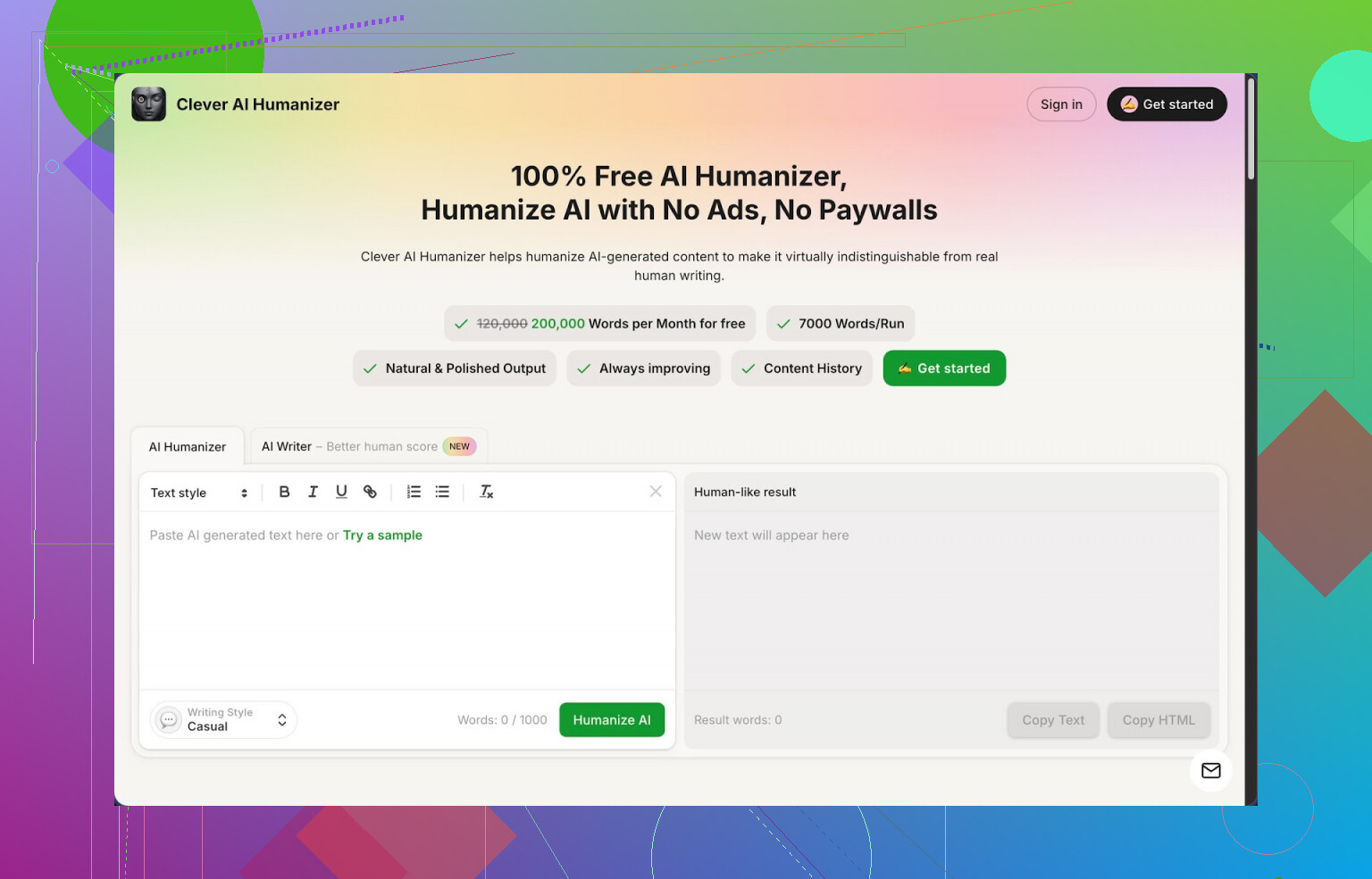 Dieses Tool generiert den Text von Grund auf, dann kannst du ihn im selben Ablauf humanisieren. Ich habe es mit einem kurzen Blog-ähnlichen Text getestet, anschließend durch den Humanizer geschickt und wieder mit Detektoren geprüft. Die Human-Score war hier etwas besser, als wenn ich Text von einer anderen KI importiert habe. Mein Eindruck ist, dass ihr Writer darauf abgestimmt ist, gut mit ihrem eigenen Humanizer zusammenzuspielen.
