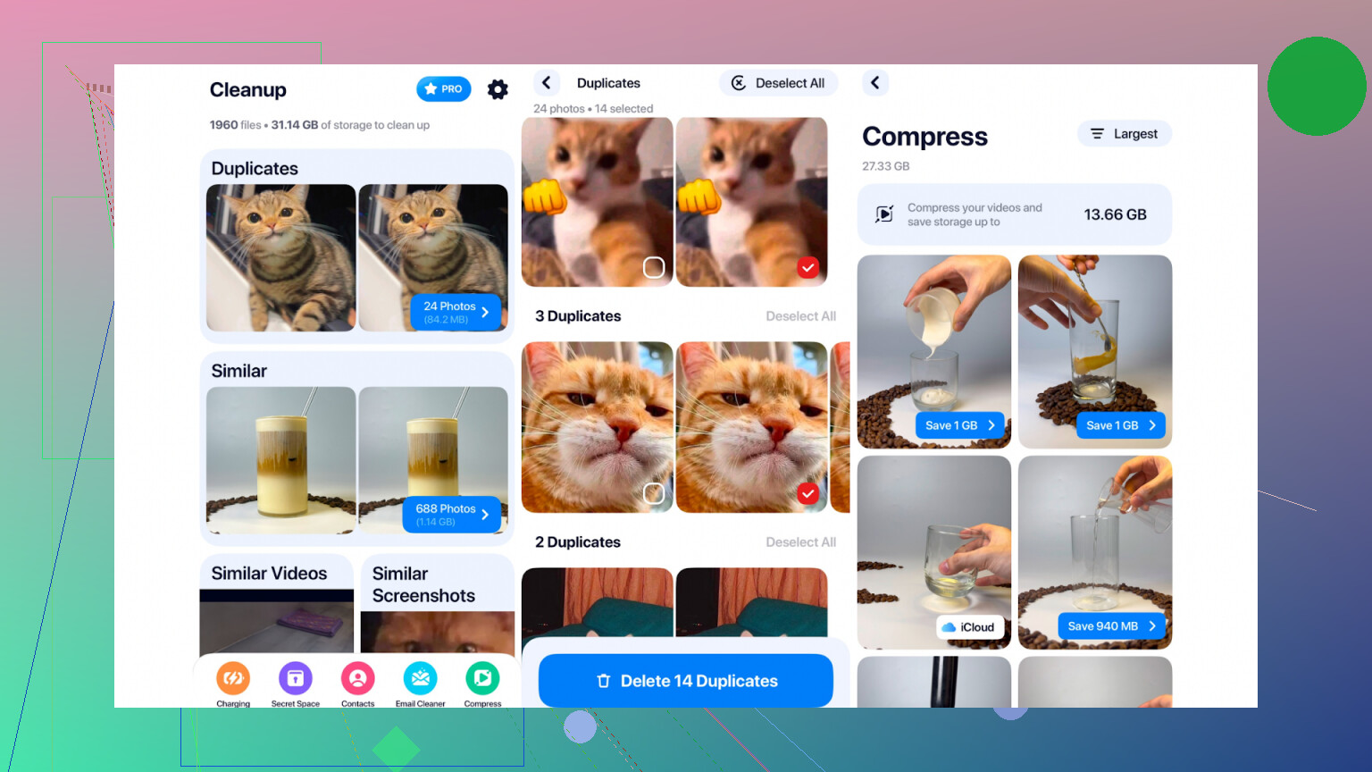 - Zawiera inteligentne czyszczenie zdjęć i filmów, czyszczenie przesunięciem palca oraz zarządzanie kontaktami/e-mailami.