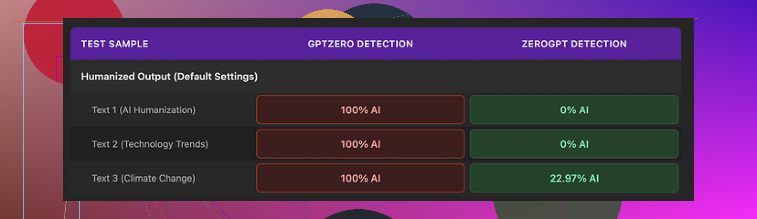 - Every single “humanized” output flagged as 100% AI.