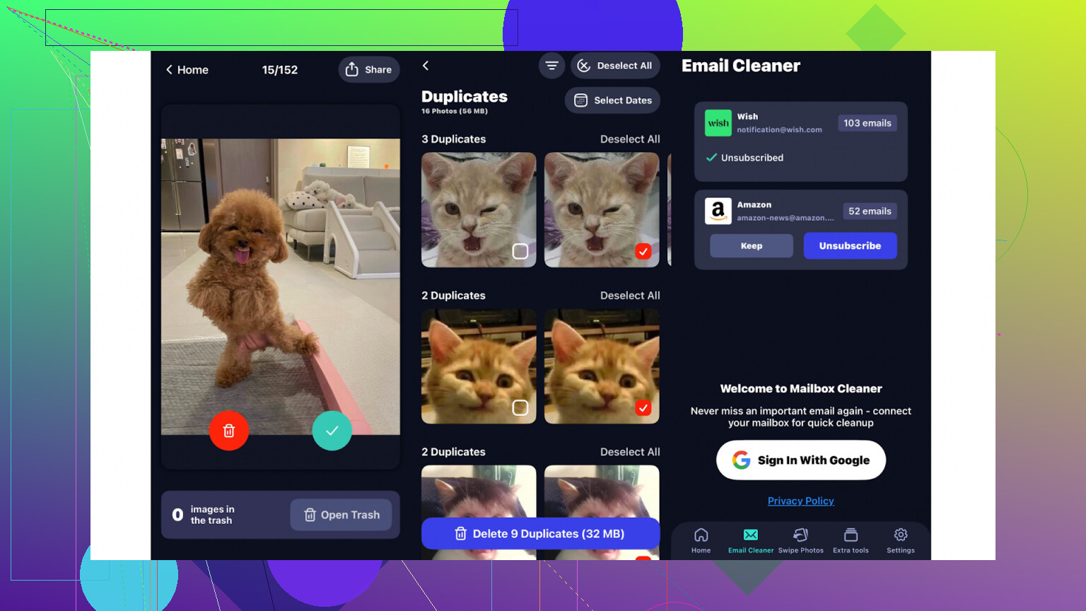 Fonctionnalité unique de nettoyage des emails, inhabituelle pour des applis similaires.