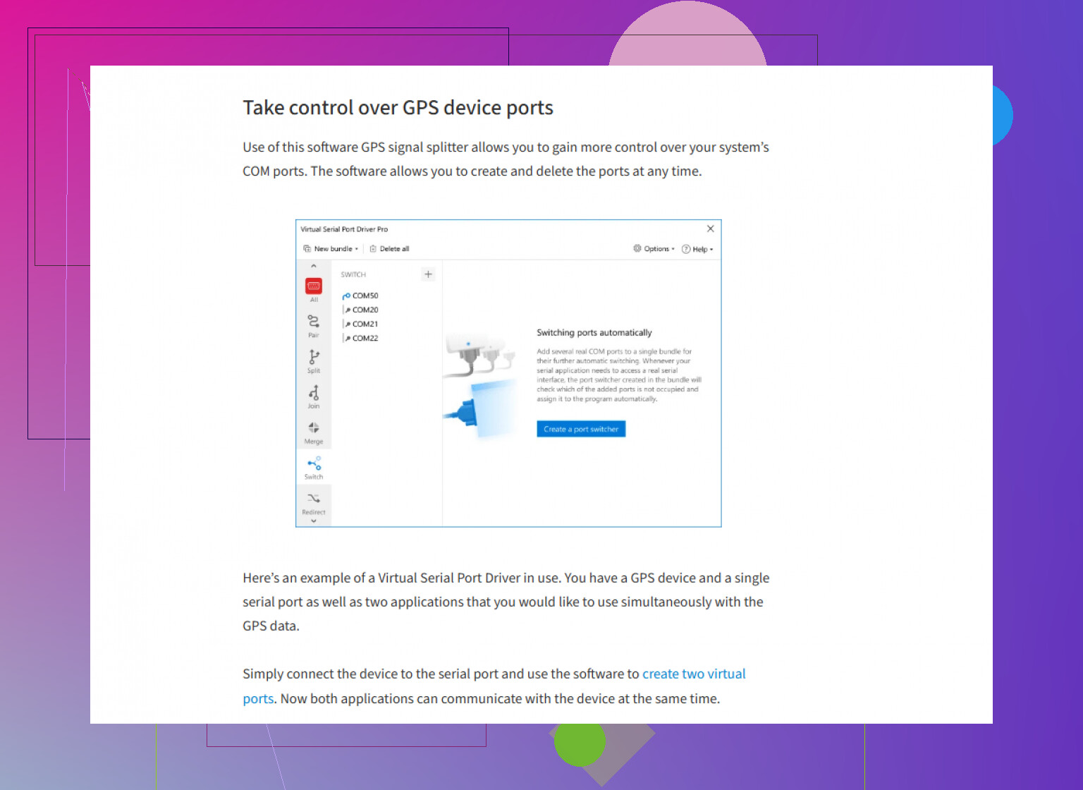 TL;DR: Software like Virtual Serial Port Driver = multiple apps, one device. Hardware split = use adapters, not hacks.